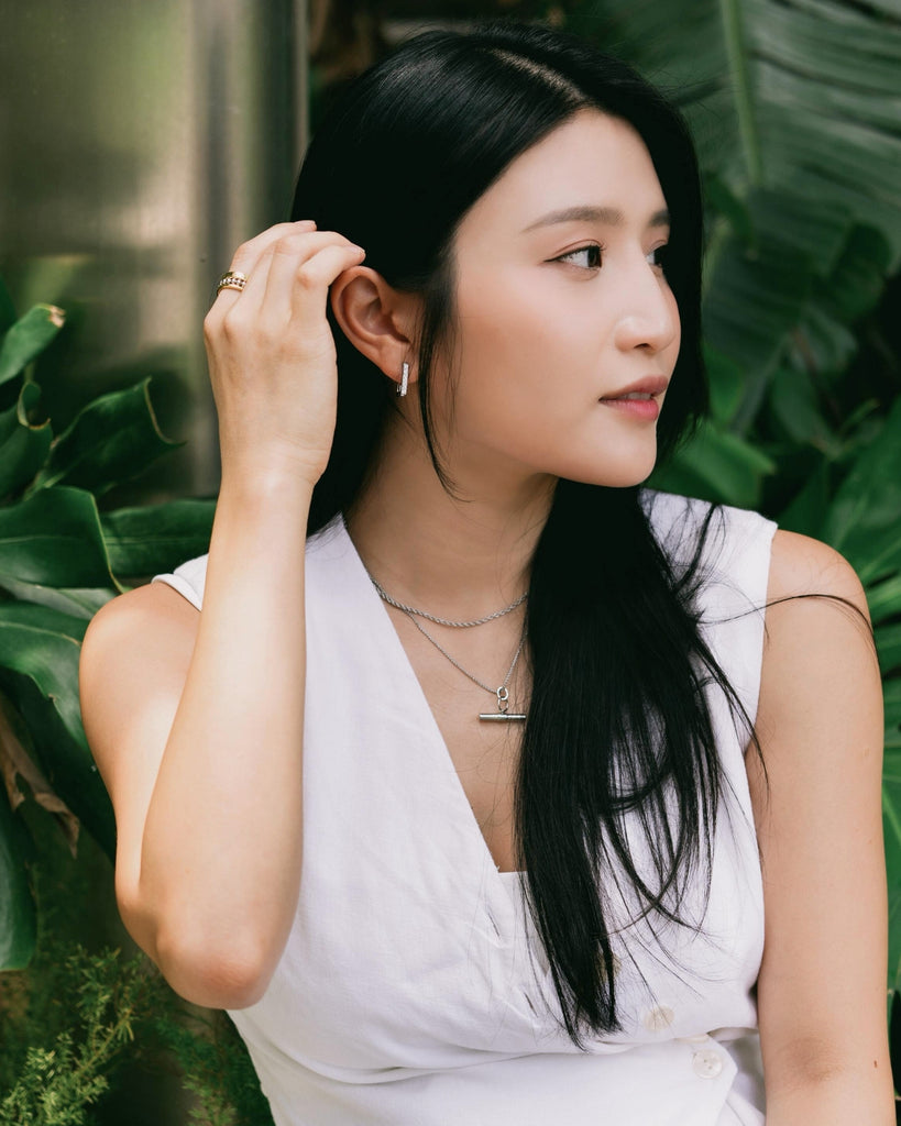 This stack features our T-Bar Charm and Round Box Chain styled with our classic Demi Chain Choker. All pieces are available in both Silver and Gold.
