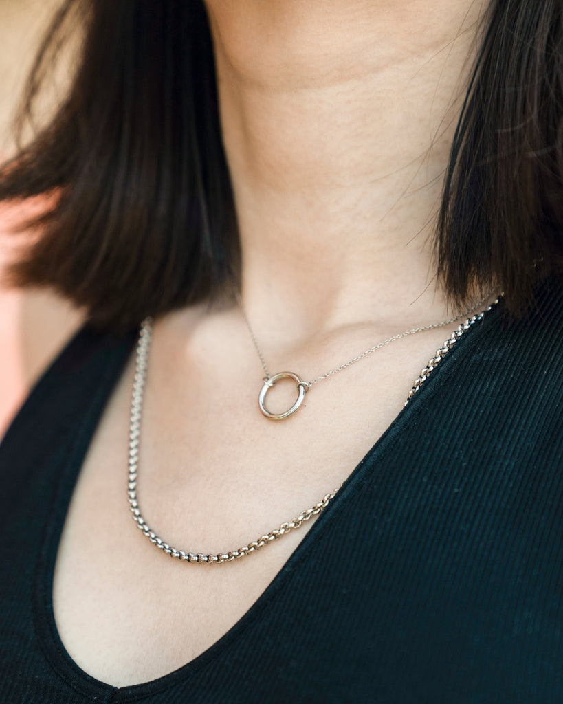 Our Emory Halo Stack features the Soma Halo Pendant and Emory Bold Box Chain and is available in both Gold and Silver. Both pieces feature an extension for flexible styling and stacking.