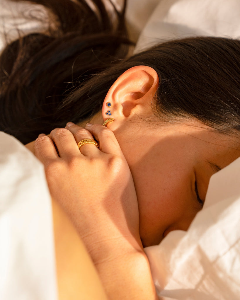 Set with three AAA Blue Sapphire stones for a vibrant, elevated touch