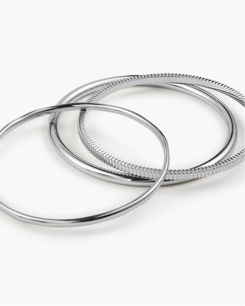 這三件套裝包括我們的 Rya 直紋手鐲、Essential 手鐲和 Maeve 紋理手鐲。每件單品均有金色和銀色可供選擇,可以組合在一起形成獨特的風格,也可以單獨佩戴以營造簡約的風格。