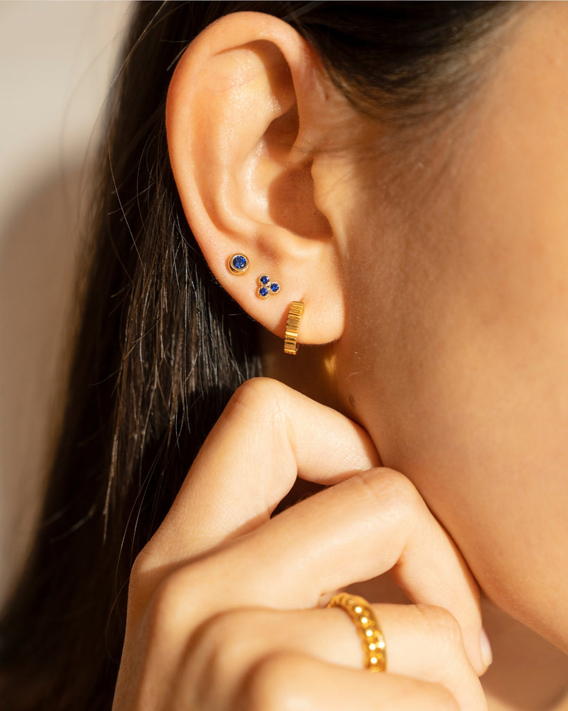 我們的耳圈專為日常穿戴而設計。包括鑲有白色和藍色藍寶石的 Iris 系列、簡約的 Lara 系列以及紋理設計系列。